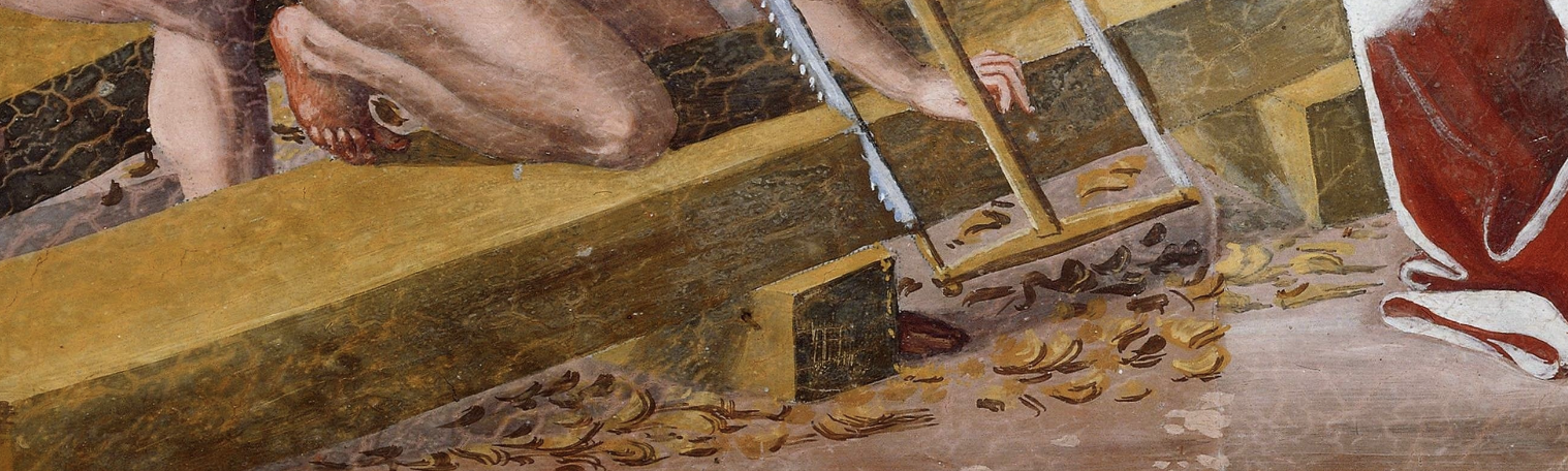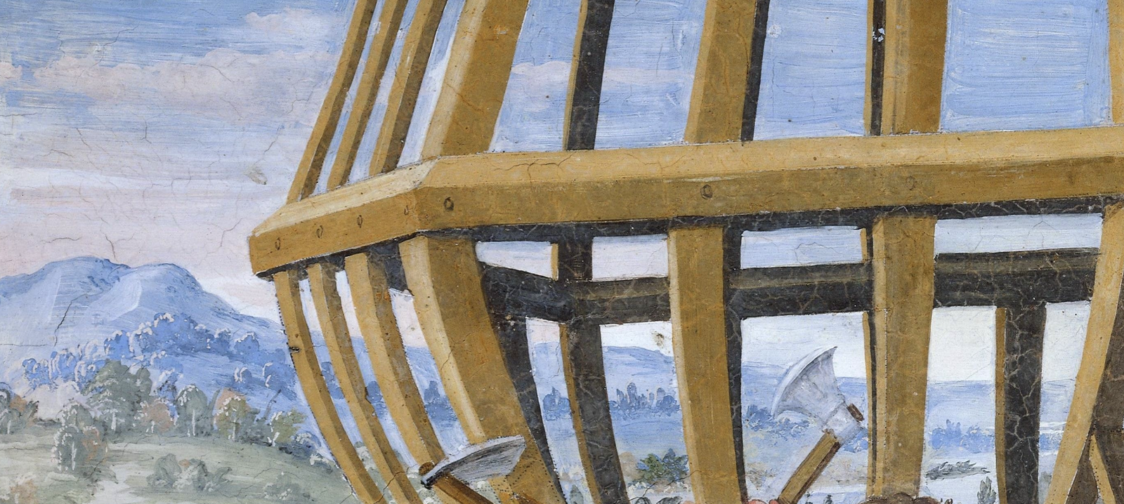 <방주를 건조하는 노아>는 교황 레오 10세의 의뢰를 받아 제작되었다. 바티칸 로지아(Logge) 천장의 작은 궁륭형 패널 중 하나로, 라파엘로 성경 연작 특유의 아담하고 집약적인 화면 구성을 따른다. 젖은 회벽 위에 안료를 칠해 벽 자체가 그림이 되게 하는 프레스코(Fresco) 기법으로, 영구적인 보존성과 장엄한 질감을 제공한다. 작품은 안정적인 피라미드 구도를 취하고 있다. 중앙의 노아는 하나님의 지시를 직접 전달받는 예언자적 위엄을 갖추고 있으며, 주변의 아들들은 방주라는 거대한 구조물을 세우기 위해 분주히 움직이는 모습이다. 발치에 쌓인 나무 부스러기들은 이 노동이 하루아침에 이루어진 것이 아님을 말없이 증언한다.