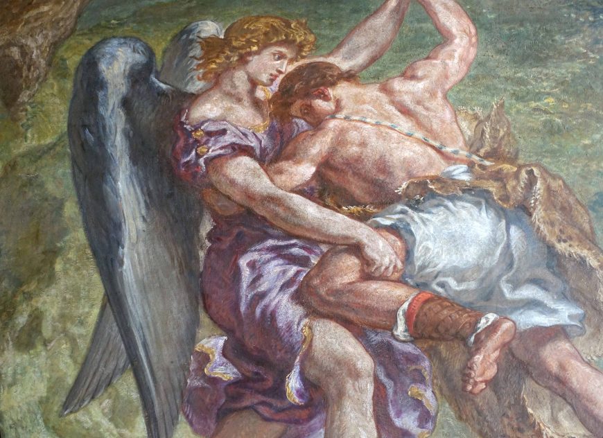 오른쪽의 인물은 밝다. 천사이다. 날개가 있고, 옷은 황금빛을 띤다. 야곱의 어두운 실루엣과 선명하게 대비된다. 들라크루아 특유의 색채 신학이 여기서 드러난다. 어둠 속에서 빛이 맞붙어 있다. 그 씨름의 결과는 야곱이 빛 쪽으로 끌려가는 것이다.